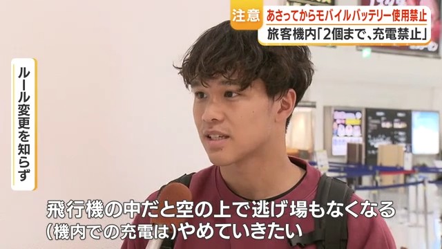 一方、ルール変更を知らなかった利用者は「飛行機に乗るまでの時間でスマートフォンを触ることが多かった。飛行機に乗っている時間で充電できないのは旅行先で不便」と戸惑いを見せながらも、「飛行機の中だと空の上で逃げ場もなくなる。(機内での充電は)やめていきたい」と話した。