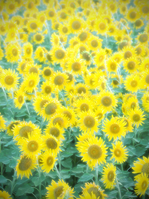 ヒマワリ畑は遠目からでも黄色い一角として目立つので見つけやすいと思います。この日に訪ねた場所は、背丈が膝上くらいの小さなヒマワリが一面に広がっていました。