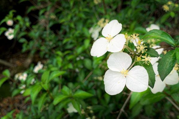 登山道の脇では白く可憐なコガクウツギを見ることができます。アジサイに似た花です。