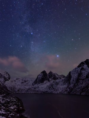 フィヨルドと星空。まさに星降る夜でした。正面に見えたのは、はくちょう座。