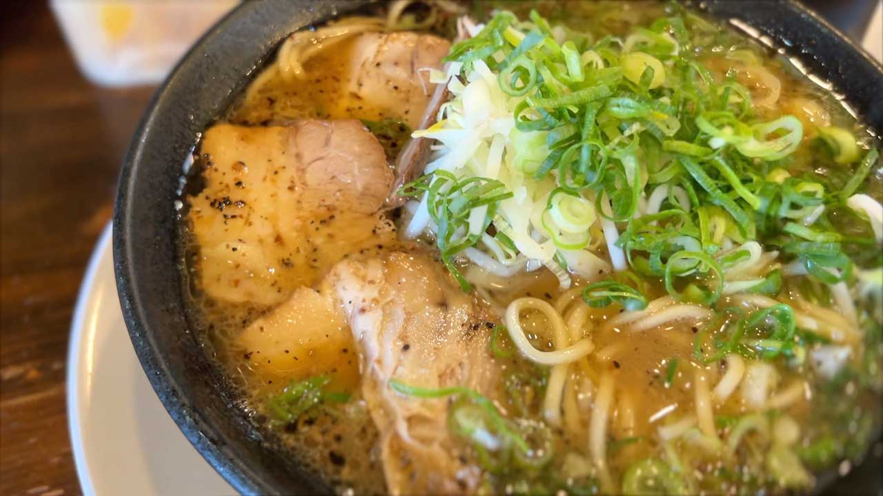 頂いたのは『焦がし豚骨かさね味』。スープをすくうと焦げた匂いが香ばしい。ひとくちすすると、見た目ほど脂っぽくなく、スーッと飲める豚骨しょうゆ。味わいがありずっと飲んでも飽きない。