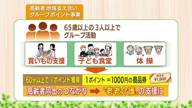 鹿児島県では2014年から「高齢者地域支え合いグループポイント事業」を実施。65歳以上の高齢者3人以上のグループでボランティアなどを行うとポイントがたまり、地域商品券などに交換できる仕組みだ。2024年は約3万7000人がこの活動に参加した。