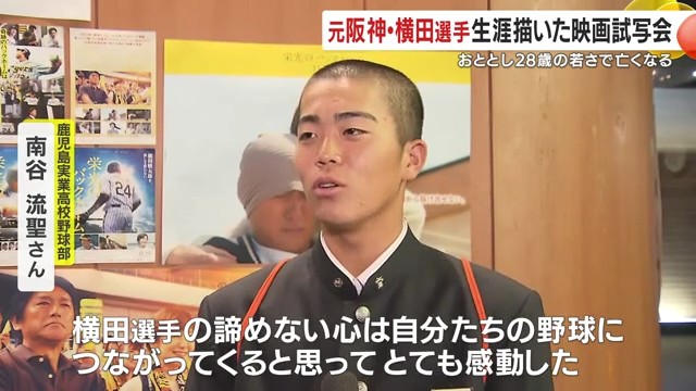 試写会に参加した鹿児島実業高校野球部の井ノ上兼悟キャプテンは「自分で立ち直って最後にバックホームを見せたところは横田さんの努力と思って、その人柄がすごいなと思った。いま自分も同じユニフォームを着て試合に出ていると思ったらもっと頑張らないと、と思った」と感想を語った。