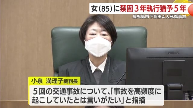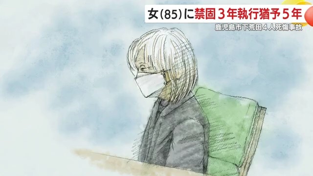 鹿児島市下荒田での死亡事故で4人を死傷させた85歳女性に対し、1月15日、鹿児島地裁は禁固3年執行猶予5年の有罪判決を言い渡した。高齢ドライバーによる事故の責任が問われた裁判の結末に注目が集まっている。