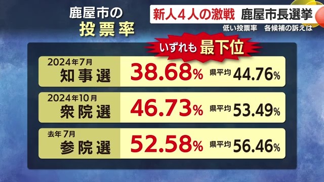 鹿屋市は県内自治体の中でも特に投票率が低いという課題を抱えていた。直近3回の選挙でもいずれも県内最低の投票率で、知事選に至っては38.68%と40%にも届いていなかった。鹿屋市選挙管理委員会は「転勤族が多いのが理由の一つではないか」との見方を示していた。