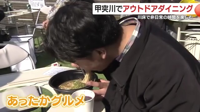 寒さを吹き飛ばす川の上ごはん「ストーブ付きテーブルでほっこり」