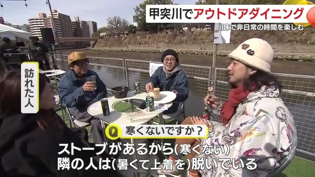 取材時の午後1時ごろの鹿児島市の気温は11.8℃。寒い季節の川床でのイベントとなったが、訪れた人たちはストーブ付きのテーブルを囲んでお酒や食事を楽しんだり、川を眺めてくつろいだりしながら、思い思いの時間を過ごしていた。