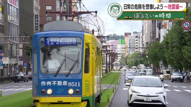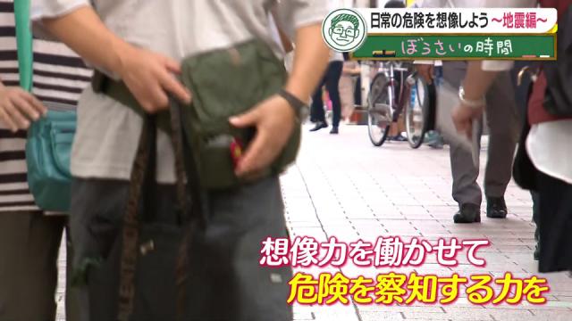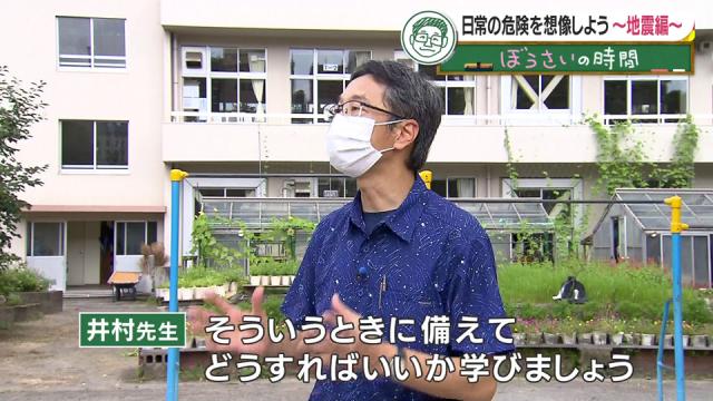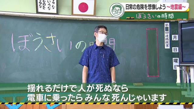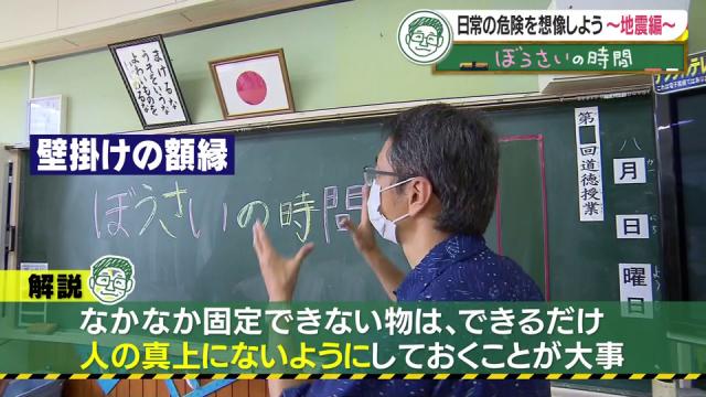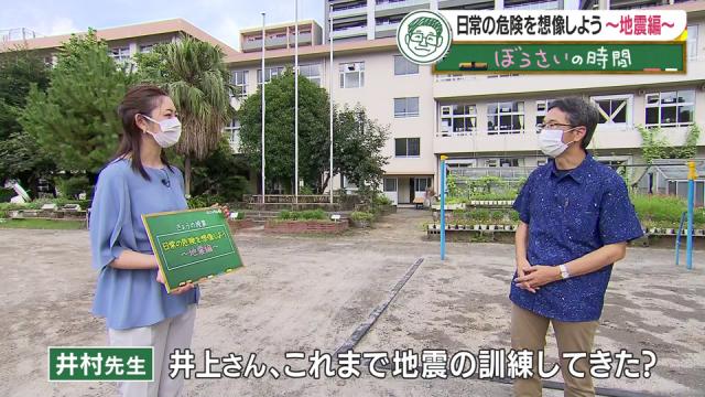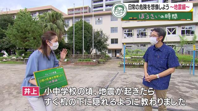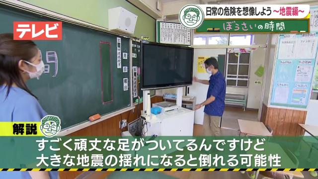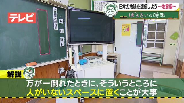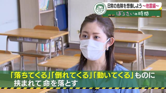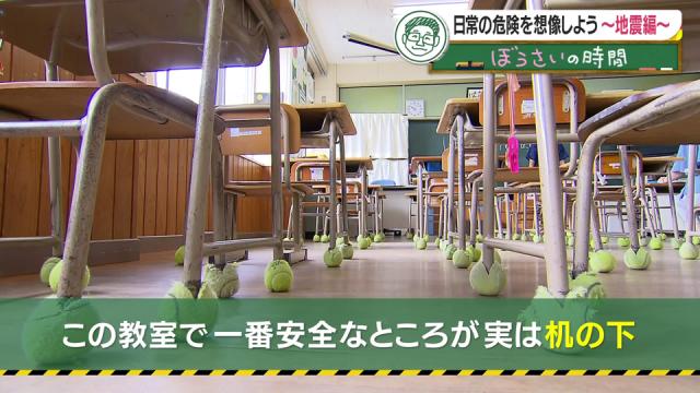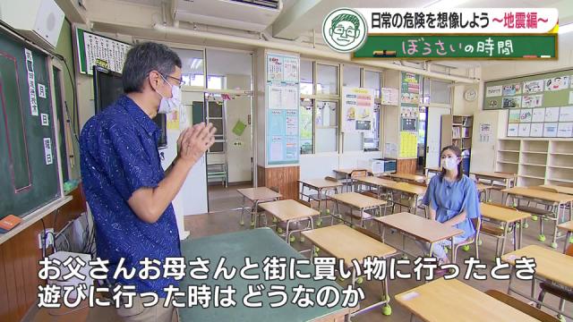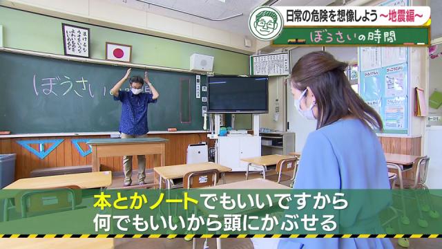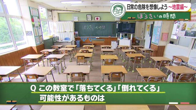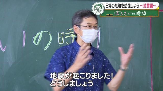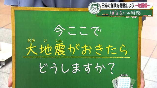 「きょうのテーマは、“日常の危険を想像しよう~地震編~”です。地震が起きたら、まずどうしたらいいですか?」