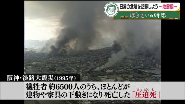 1995年に起きた阪神・淡路大震災では、犠牲者約6500人のほとんどが、倒壊した建物や家具などの下敷きになって死亡した、「圧迫死」でした。
