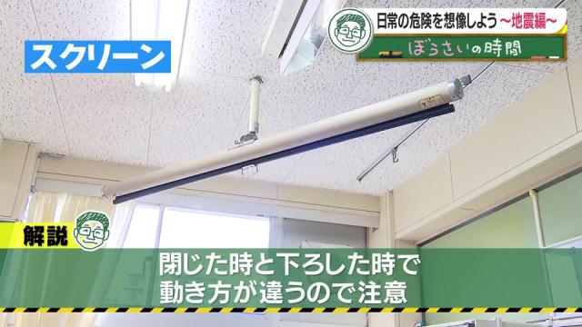 「この教室の中で、落ちてくる、倒れてくる可能性があるものはなんでしょう?」
