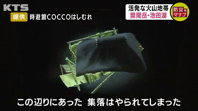今から約6400年前・縄文時代なんですけど、とても大きな噴火で桜島の大正クラスの噴火より10倍くらい大きい噴火がありました。今、同じような噴火が起こると、指宿の街全体が火山灰の下に埋もれてしまうと考えられます。