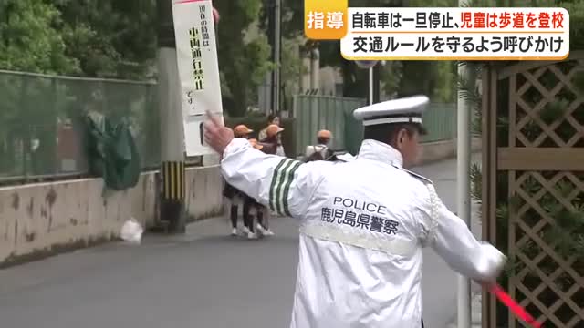 自転車は一旦停止、児童は歩道を登校 交通ルールを守るよう呼びかけ 鹿児島