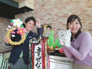 こちらの写真は相方の上片平アナウンサーと。飾り付けの為にせっせと作ったバルーンのしめ縄と門松と共にパシャリ♪