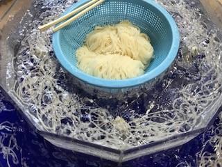 水の中を泳ぐように流れるそうめんが、食べ頃の冷たさでつゆはちょっと甘めで