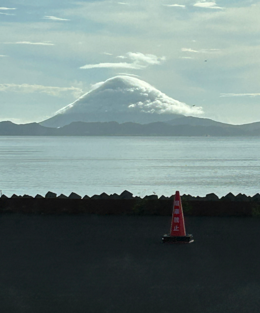 「大隅半島から見た開聞岳が雲に覆われてて、