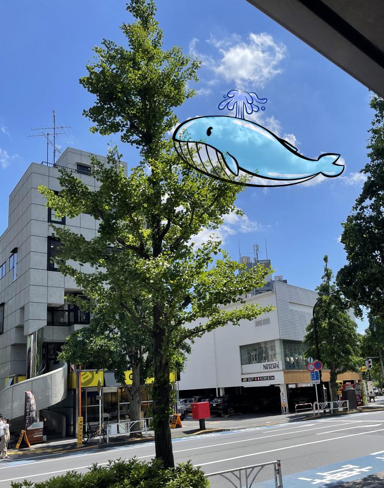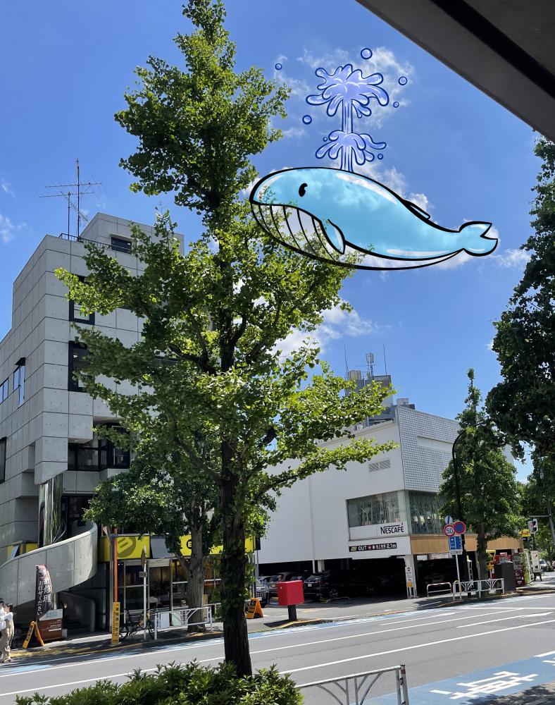 街路樹の緑と青空が爽やかなお写真ですが・・・かわいい海の生き物が隠れています。