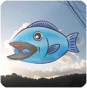 「口を大きく開けた魚とそれに気づいた魚たちが、