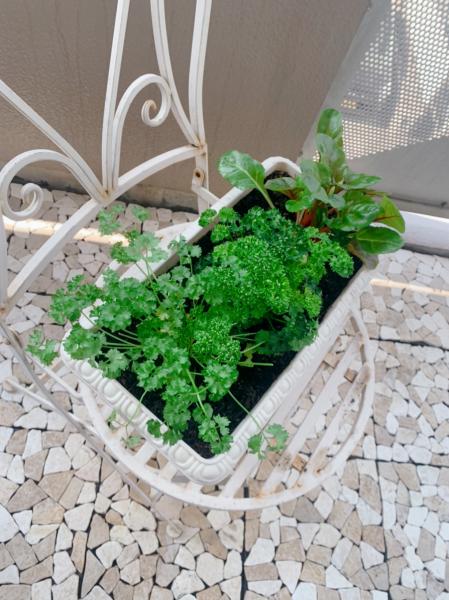 パセリやスイスチャード、ローズマリーなどが自宅のベランダに並んでいます。