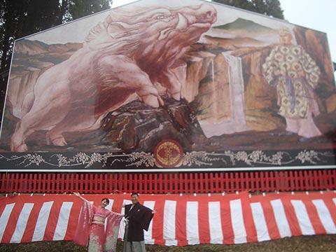 ここには、畳約50畳程の大きな猪の絵馬と白イノシシの「わけちゃん」がいます。