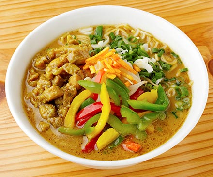塩ラーメンの名店が革新の限定メニューで挑む!コク深いトンコツしょうゆにこだわりの自家製咖喱パウダーをブレンド。スパイシーなキレとマイルドな口当たりを両立している。咖喱味が効いた鶏肉は歯ごたえが良く、3色パプリカやスティックポテトの食感もアクセント。ラーメン通もカレー好きも大満足の一杯だ。