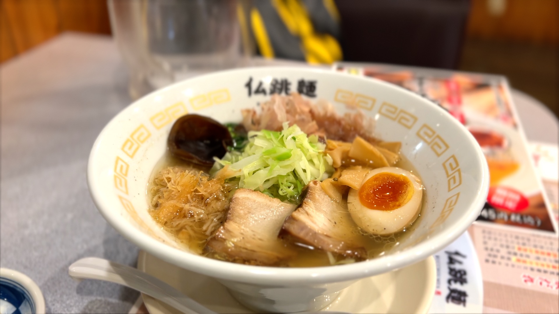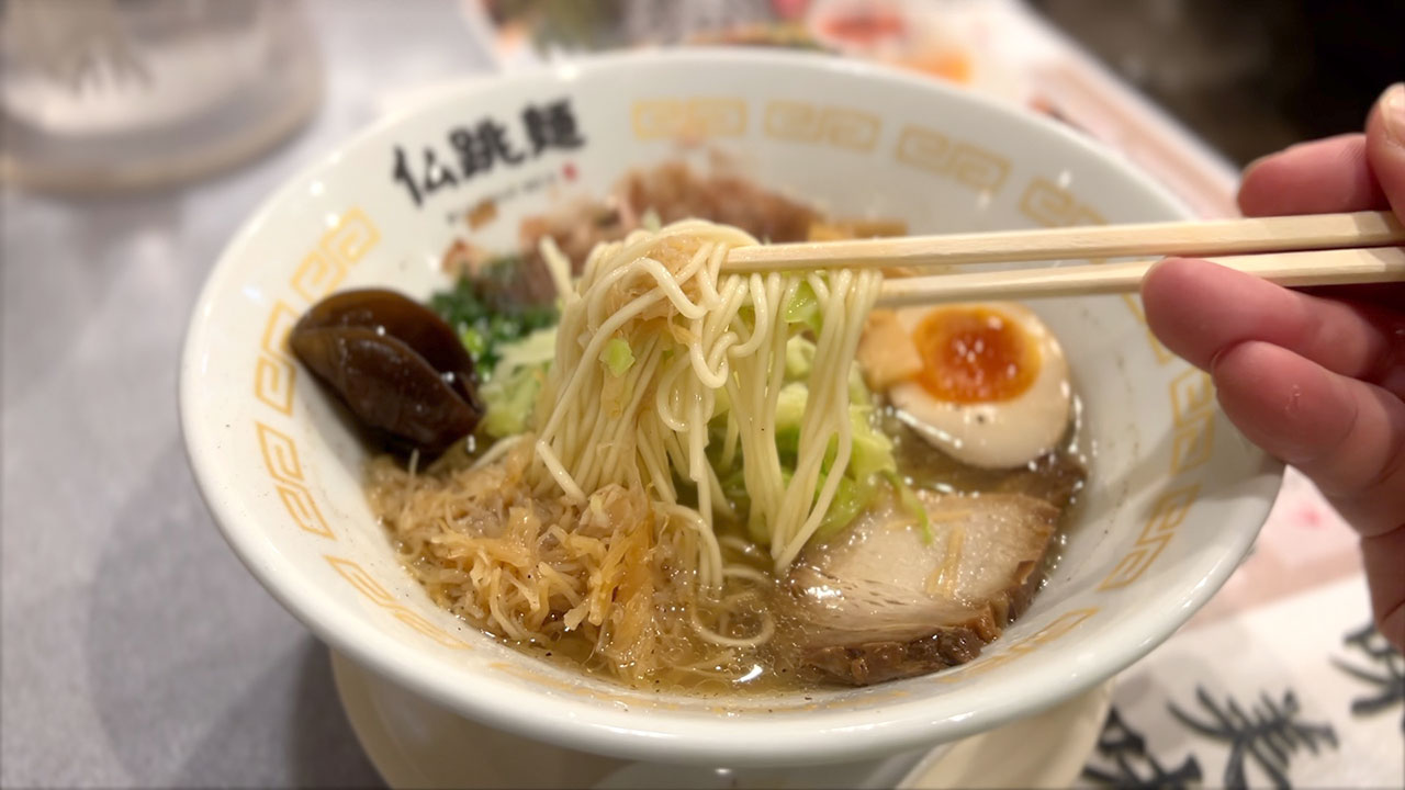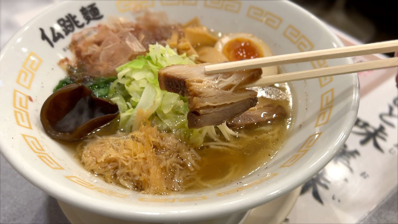 あっさり豚骨の細麺がこちらの基本メニューだが、今回はレギュラーメニューの中でリッチな特選仏跳麺 極を注文。金ぴかスープは透き通っており、贅沢に具が並べてあって高級感。あっさり優しく、ホタテの味を全面にだしたスープかな…と思いきや、一口飲んでビックリ。