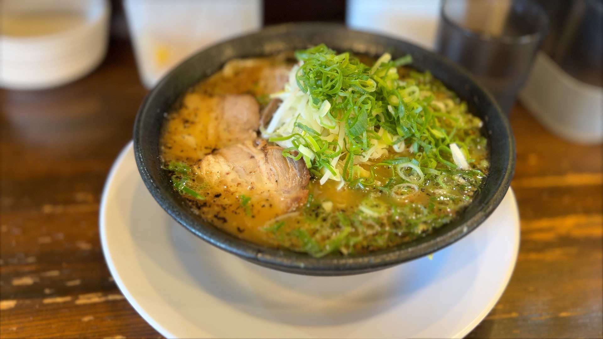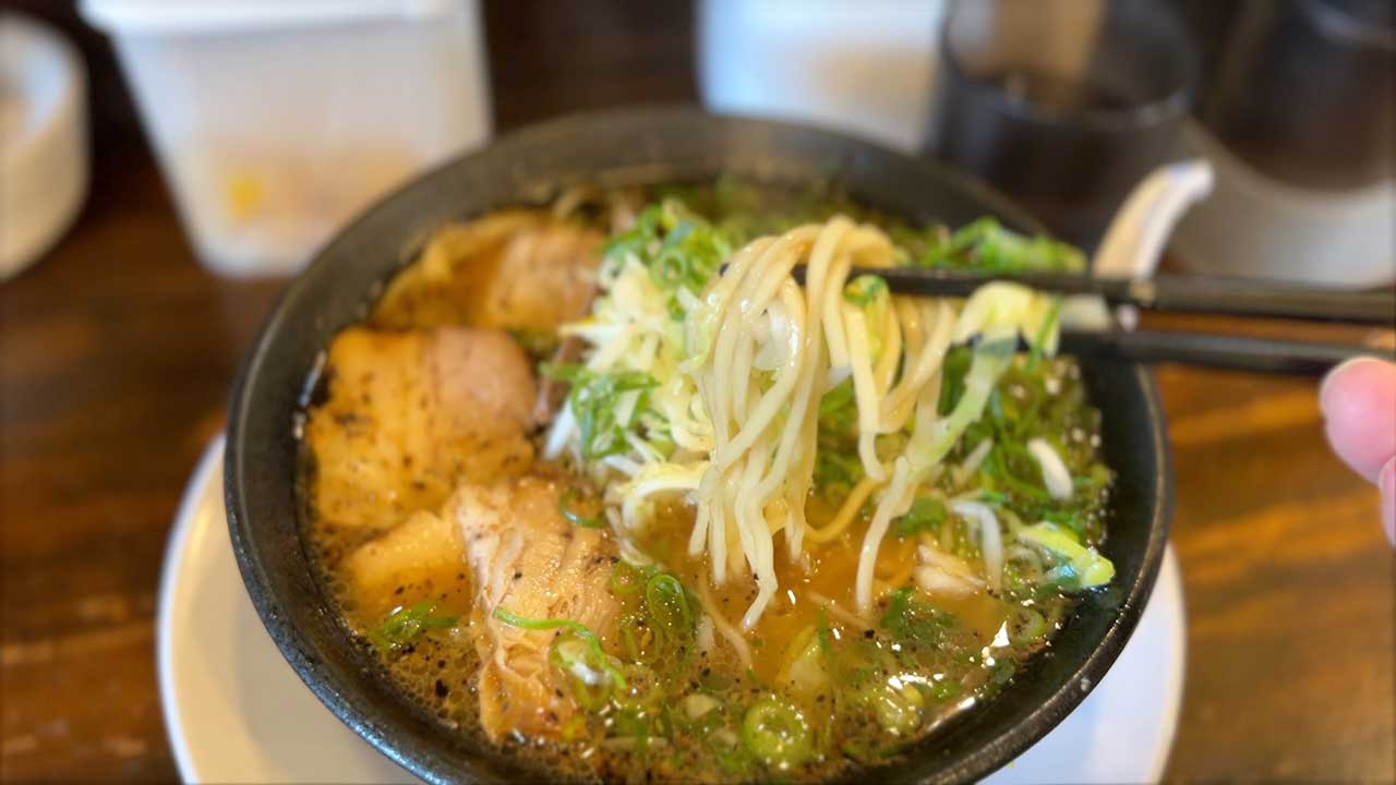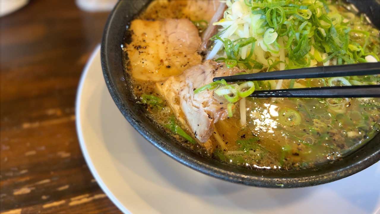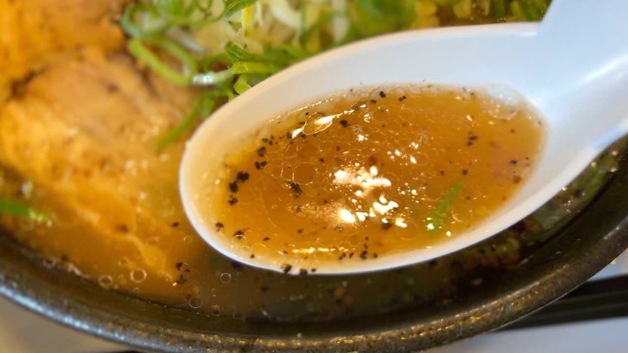 頂いたのは『焦がし豚骨かさね味』。スープをすくうと焦げた匂いが香ばしい。ひとくちすすると、見た目ほど脂っぽくなく、スーッと飲める豚骨しょうゆ。味わいがありずっと飲んでも飽きない。
