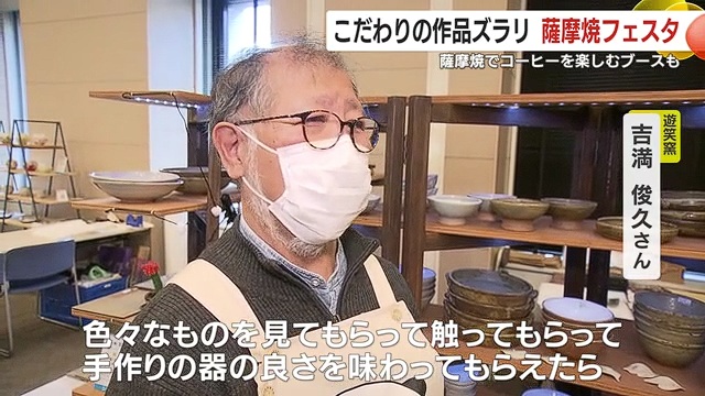 会場では、湯飲みやお茶碗など多彩な薩摩焼の作品が並び、来場者は各窯元のブースで説明を受けながら、お気に入りの商品を探していた。