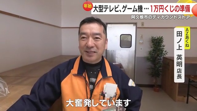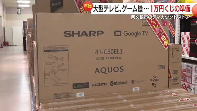 鹿児島県阿久根市のディスカウントストア「AZあくね」では、県内で最も早いとされる初売り「福くじ」の準備が整った。1万円で購入できるこの「福くじ」は、55型の大型テレビや人気ゲーム機、プレミア焼酎など、販売価格を上回る豪華景品が当たることで知られている。