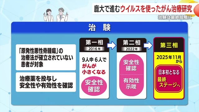 2016年から始まった治験では、骨に発生する希少がん「原発性悪性骨腫瘍」の患者を対象に、注射による局所投与で治療薬の効果を検証している。従来の抗がん剤が全身投与だったのに対し、副反応も発熱などの軽度なものにとどまっている。