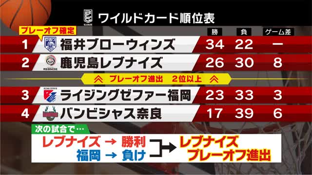 レブナイズが次の試合で勝利し、福岡が負けるとワイルドカード2位が確定し、プレーオフ進出が決まります。