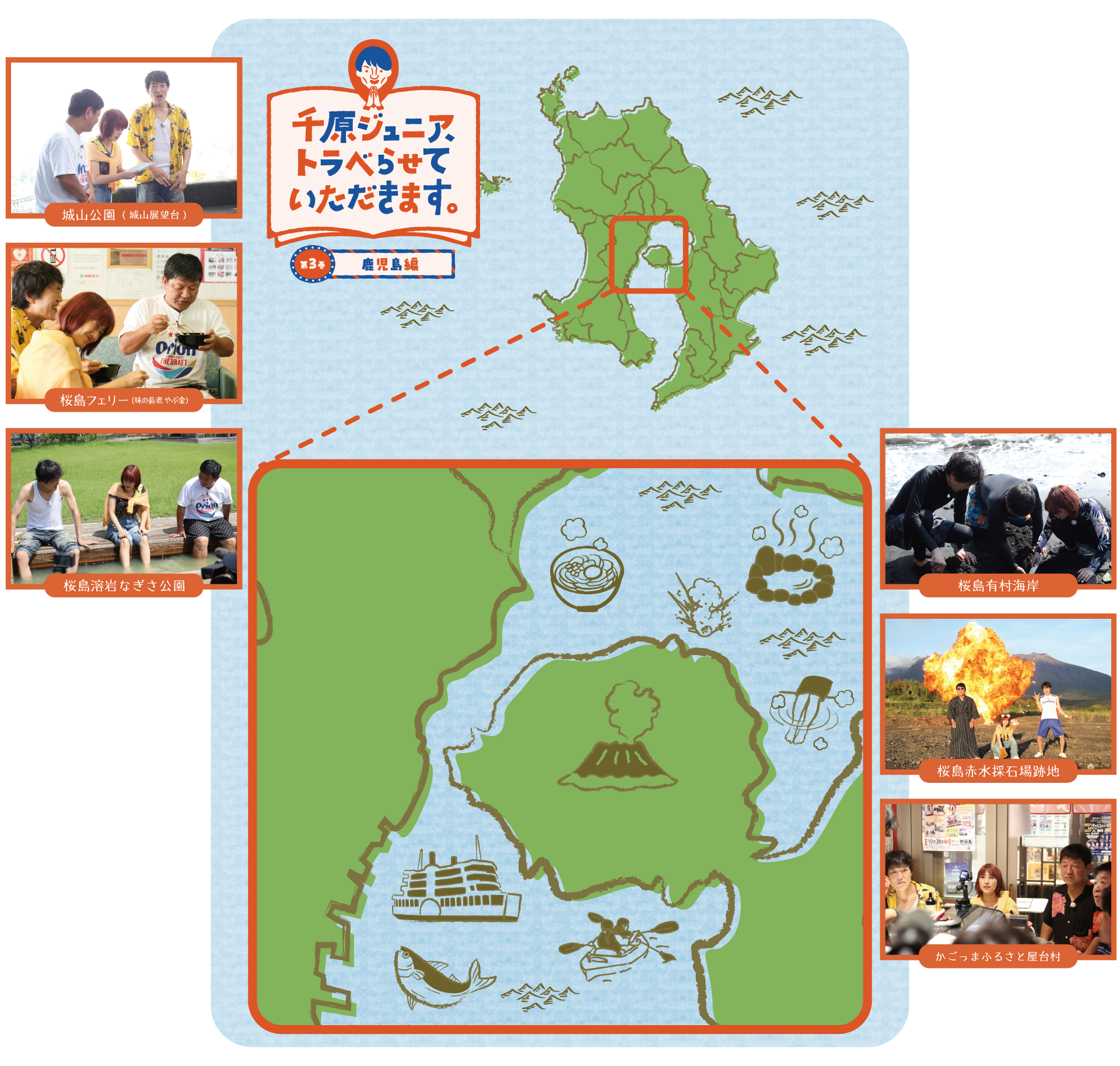 今回は桜島を中心に、地元民おすすめのスポットを訪ねる。桜島フェリーの定番「うどん」を皮切りに、火山の迫力を間近に感じられるカヤック体験や、チャンス大城がまさかの温泉を掘り当てる!?そして、桜島でしかできないド派手な特撮体験では、大御所・千原ジュニアが県出身のあの芸人になりきって「イエェェェェ~イ!」夜は、かごっまふるさと屋台村にローカルタレント・タマリが登場し、一同困惑!?
