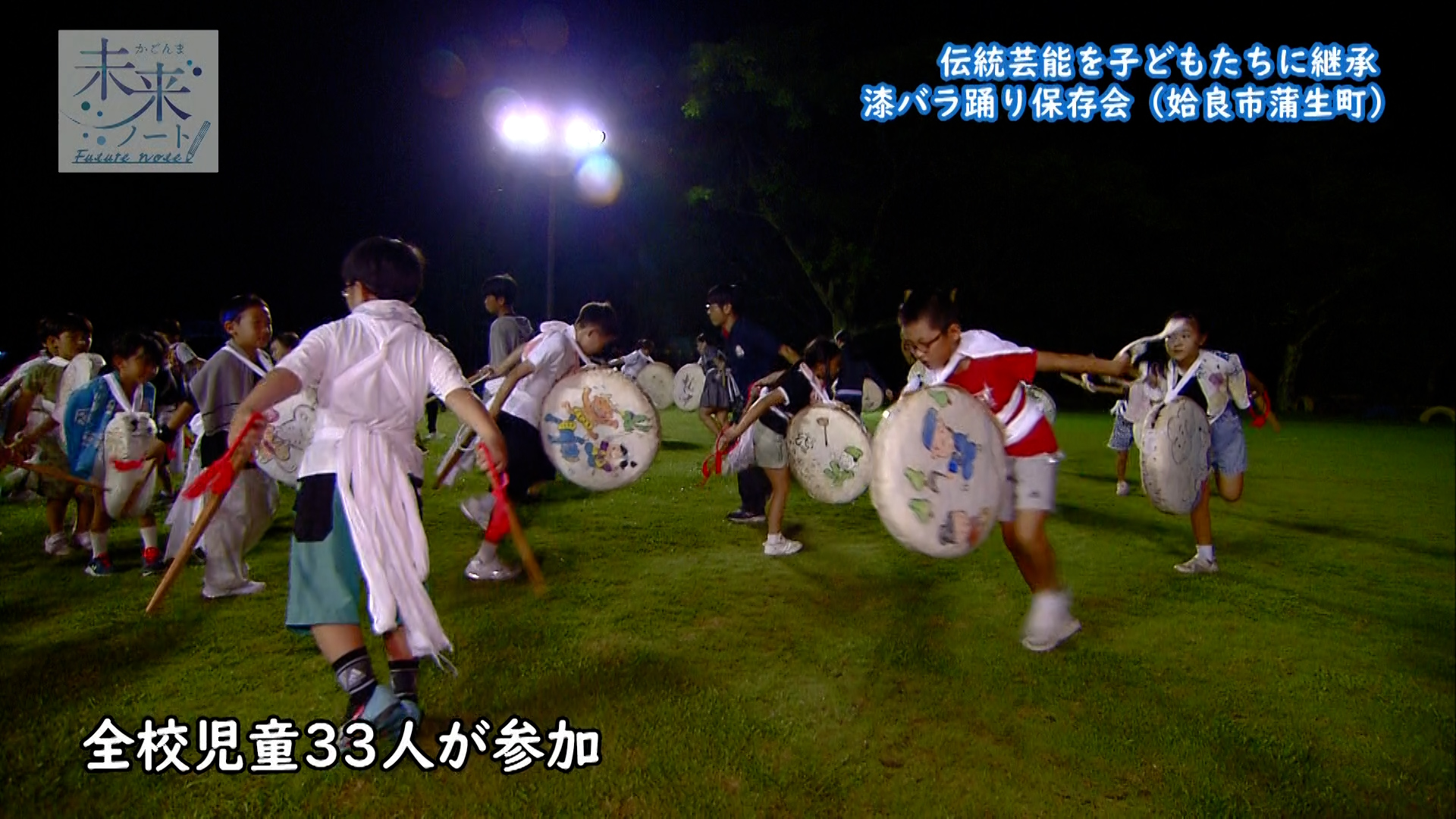 鉦とバラデコと呼ばれる太鼓をたたき踊るこどもたち。