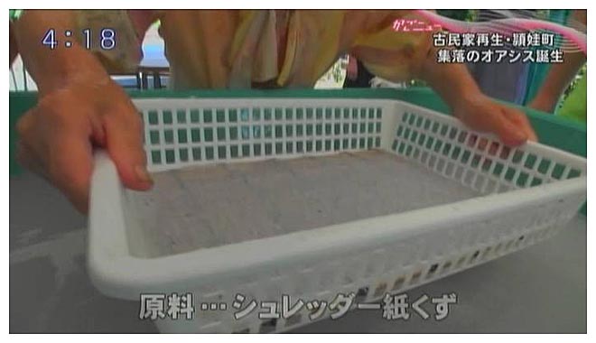 シュレッダー紙くずから紙を再生し、古民家の壁に貼りました。