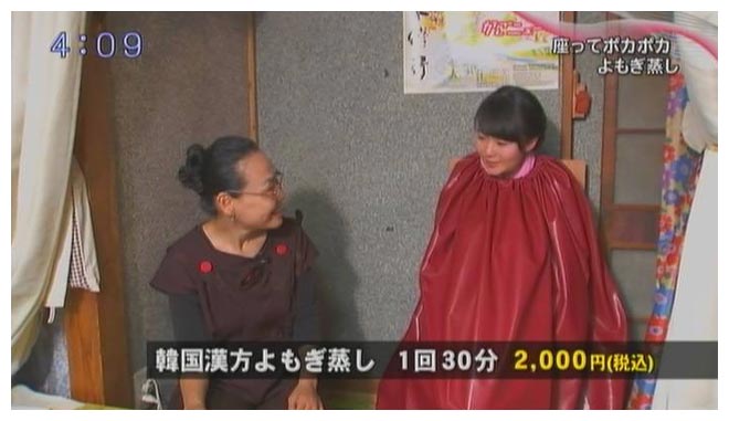 よもぎ蒸しとは…穴の開いたイスの下で漢方薬を煮立たせて全裸の状態でマントを着用し蒸気に包まれる韓国の民間療法。漢方薬はよもぎを中心に20種類をブレンドされており、漢方の蒸気を体の気になる所に当てると良いそうです。体をじっくりと温めることで汗腺機能が高まりサラサラ汗になり、エアロビクス3時間相当の汗が出ると言われています。