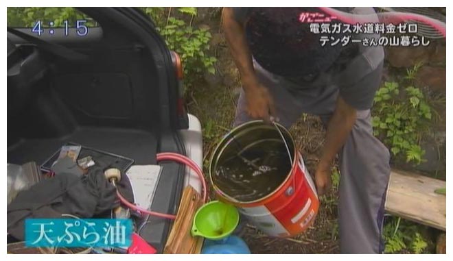 また、中古のディーゼル車を15万円で購入しました。ディーゼル車を改良し、知り合いから譲ってもらった天ぷら油をろ過して入れると動きます。