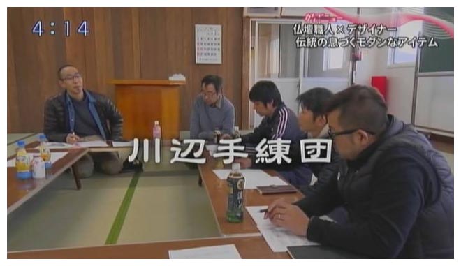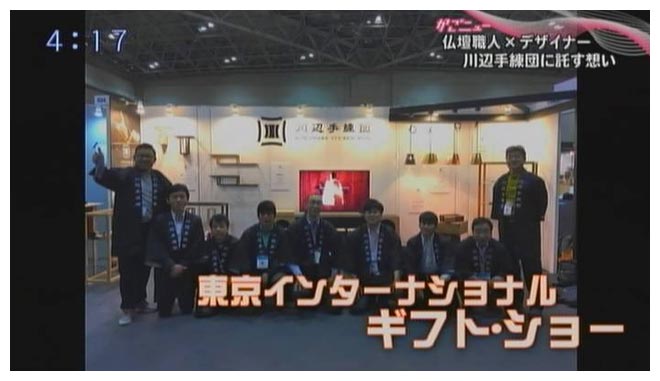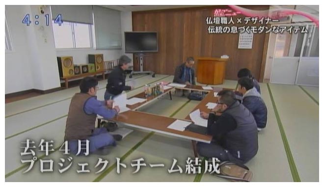 最近は、家が小さくなり床の間を作らなくなり、仏壇の需要はがた落ち、家庭環境の変化とかにより、仏壇業界も厳しい状況です。危機感を感じた永野一彦さん達が、昨年4月にプロジェクトチームを結成しました。伝統の技術を駆使して楽しみながら今の時代へ仏壇技術を伝えようと、仏壇職人とデザイナーをコラボし、ランプ(金具)・キャビネット(金具・木地)神棚(木地・塗り)などを作成。細部まで気を配った機能的なデザインで、現代の生活に寄り添った商品が多くを占めます。また東京インターナショナルキフトショーにも出品しました。