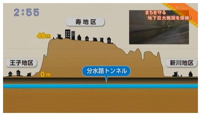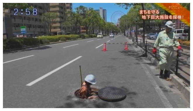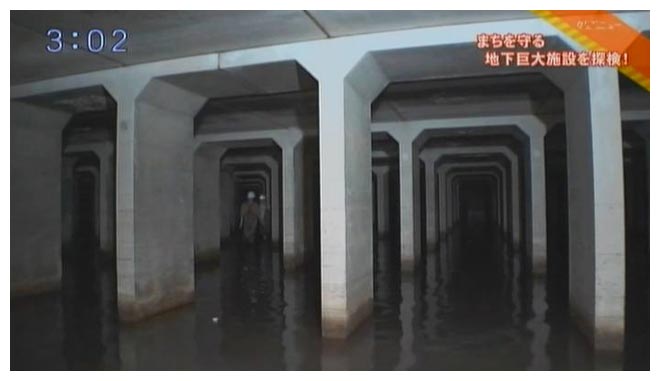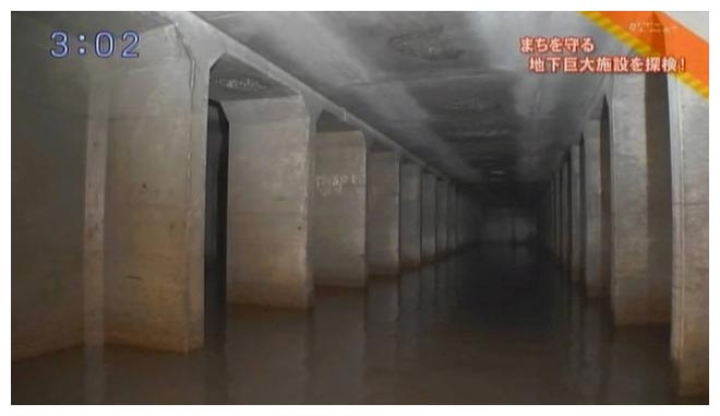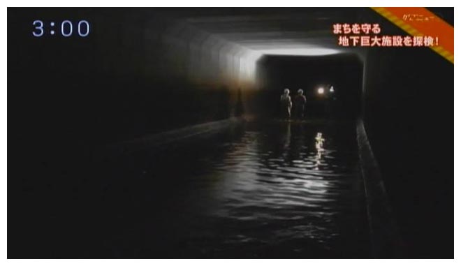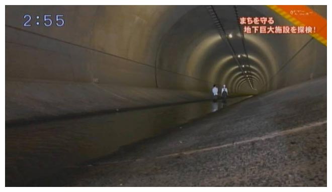 ナポリ通りの地下にある高さ3.5m、幅5.5m、全長1.1kmの施設。常盤、鶴丸高校、武町周辺からの雨水をこの水路に流し込んでいます。また、水路から逆流しないような仕掛けも付けられています。
