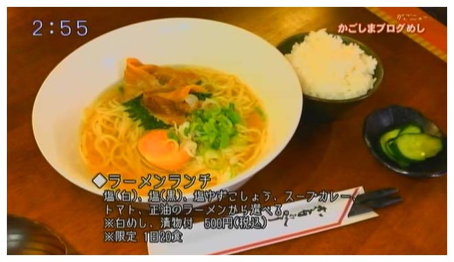 ラーメンランチ 500円(塩白・塩黒・塩ゆずこしょう・スープカレー・トマト・醤油から選べます)※白めしと漬物付。限定20食