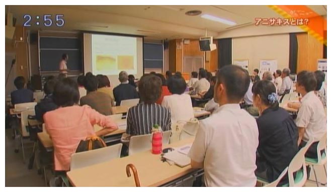 鹿児島大学水産学部では〝アニサキス〟についての講演会を緊急企画しました。講師は、魚の病気を専門とする山本教授。学生、一般の方、漁師、スーパーの鮮魚担当の人まで、およそ100人が集まりました。