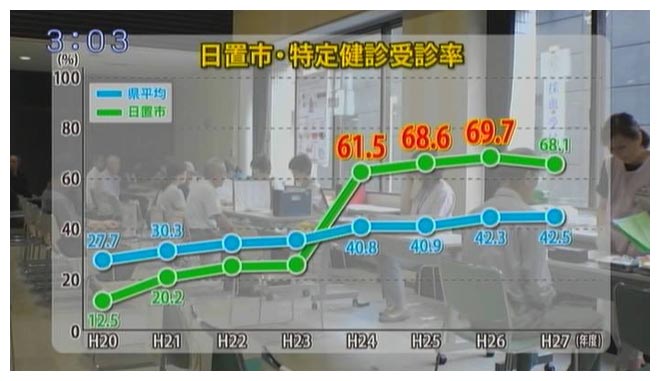昔はほとんどの対象者が集団検診を受けていませんでした。これでは市民の健康があぶないということで、市では受診率アップを目指す特別プロジェクトを立ち上げました。保険推進員や市の職員が、健診を受けていない人の家を訪問するなど、全庁体制で健康診断に行くよう呼びかけました。すると1割ほどしかなかった受診率がなんと7割近くまでアップ。プロジェクトが終わった今でも高い受診率をキープしているほか、県内の他の自治体にも同じような取り組みが広がっているそうです。