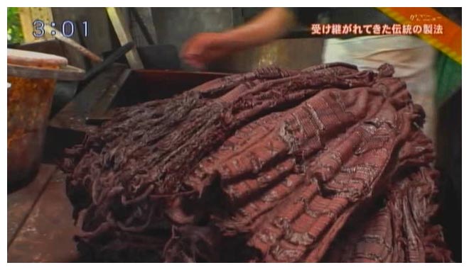大きな窯でテーチ木を煮出し作られる染料。これで糸を染めていきます。テーチ木で染めた後は泥の田んぼ、泥田へ移します。これを1時間くらい続けます。これが終わると工房へ帰って泥を落として、またテーチ木染めると言う工程を7、80回繰り返していきます。全てが手作業。手間と時間をかけ、丁寧に染めていきます。