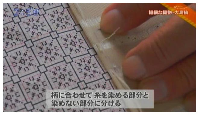 7月。厳しい暑さの中、図案を元に実際に作っていく作業が行われていました。大島紬の工程は大きく分けて5つ。図案→絣締(かすりしめ)→染色→加工→織り。図案が出来た後は、絣締(かすりしめ)という作業に移っていきます。これは糸を染める前の準備作業です。紬のベースとなる絹糸を木綿の糸で締めていきます。少し黄みがかった部分は糸がしめられた部分。染めても色がつきません。逆に、白っぽい部分は締められていないので、染めたときに色が付きます。こうして分けていくことで、柄の元となる糸が出来ていきます。