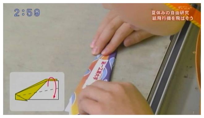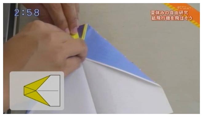 「やりひこうき」の作り方!まずは紙の端っこを三角に折ります。さらに紙をおって翼をつくります。そして、とがった部分を折り曲げるのが大きなポイントです。あとは紙を半分に折って翼を広げて完成です。コツは左右が同じになるように丁寧に折ること。落ちそうで落ちない。これがいい紙飛行機の証です。ギネス記録は約70mと言う事です。