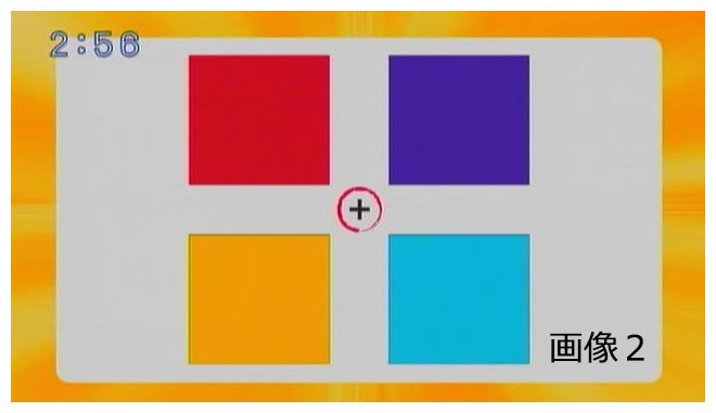 画面に色がついた4つの四角(画像2)があります。これを灰色の四角(画像3)に切り替えても、色が見えると言うんです。画面の真ん中のプラスマーク(画像2)をじーっと15秒間、真ん中だけを見続けて下さい。そして、灰色の四角(画像3)に切り替えても、色が付いて見えます(画像4)。真ん中だけを見続けるのがコツです。