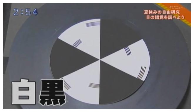 鹿児島大学工学部の大塚作一教授を訪ねました。科学の立場から目を研究するスペシャリストです。先生が取り出したのは白と黒の模様がかかれた円盤。この円盤を回すと黒い線の部分に色が付いて見えます。人によって見え方に差はありますが、内側は青っぽく外側は黄色っぽく見えます。