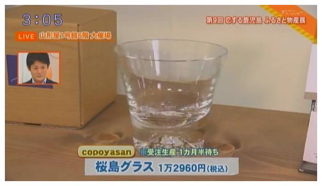 今回もう在庫がなくなってしまった人気商品「桜島グラス」です。こちら商品グラスの底を見ると、桜島の形になっています。そしてこのグラス、飲み物を入れると、この桜島がその飲み物の色に染まるんです。一つ一つ手作りで作られていて、今回初出店ながら、こちらの商品人気すぎてなくなってしまったんです。