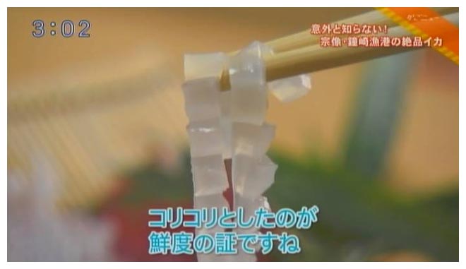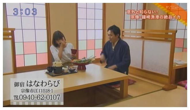 宗像は西日本の海女の発祥のまちということで、昔から漁業が盛んです。福岡県でもっとも大きな鐘崎漁港があり、イカが豊富に獲れることでも有名です。新鮮なイカを存分に味わえるという「御宿 はなわらび」に行ってみました。イカの活き造りがついた、玄海活イカ膳はイカシュウマイに、イカ入り茶碗蒸し、げその唐揚げとイカ三昧です。イカは鮮度が命。新鮮なイカは透明でかめばかむほど甘みがまします。