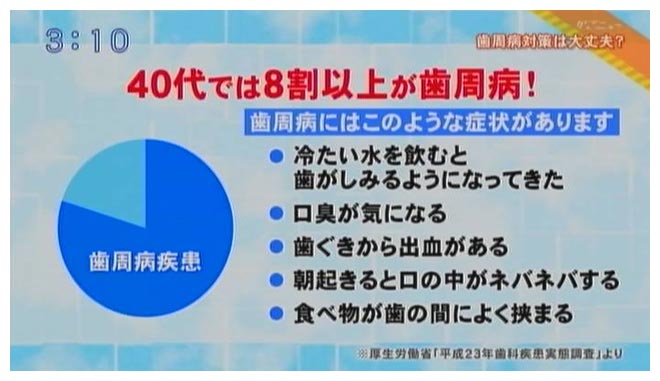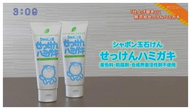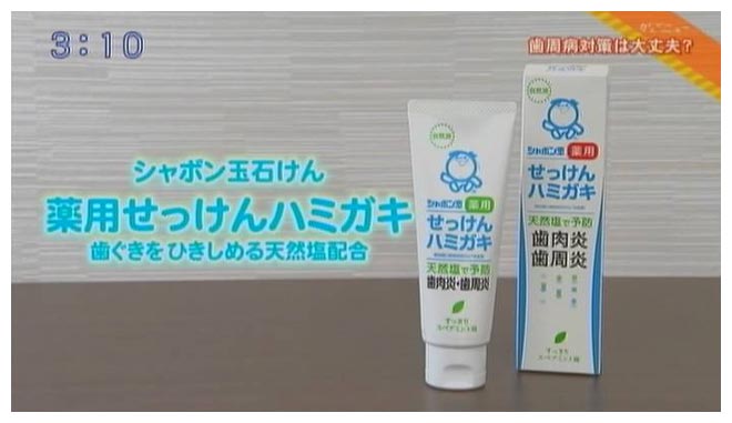 そして、「お口の健康」と言えば大人にとっても大きな問題です。40代の方の8割以上が、何らかの「歯周病疾患」を抱えているというんです。冷たい水が歯にしみる、口臭、歯ぐきからの出血などの症状に覚えがある方は、ブラッシングケアを心掛けてください。「薬用せっけんハミガキ」は、天然塩が歯ぐきを引き締め、歯肉炎や歯周炎の予防効果が期待できる、自然派の薬用ハミガキです。