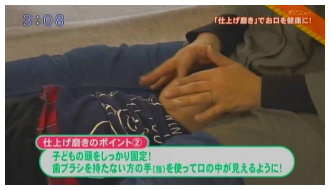 ・子どもの頭をしっかり固定!歯ブラシを持たない方の手を使って口の中が見えるように