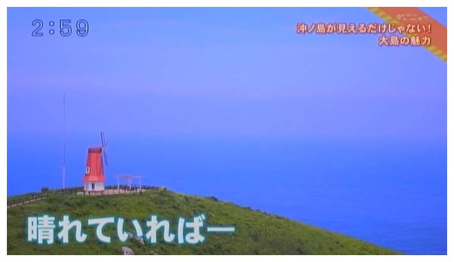 神職以外は立ち入ることができない神聖な島、沖ノ島。宗像本土から10キロ沖合に有り、島の北側には沖ノ島を臨める場所があります。しかし大島からでも50キロ離れているため、天候の条件が揃わないと見ることはは出来ません。見える日は、一年に60日ほどしかないと言います。海の彼方にうっすら浮かんでいるのが沖ノ島です。島全体が御神体であり、宗像大社の3つの神社の中で、もっとも神聖な場所とされてきました。いにしえより厳重な掟によって守られており、沖ノ島で見つかったおよそ8万点の出土品すべては国宝に指定されています。